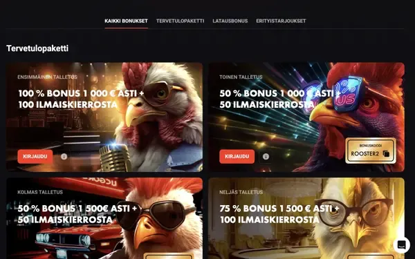 Kampanjamme rakentuvat talletusten, reload-bonusten ja säännöllisten palkintotapahtumien ympärille. Jokaisessa tarjouksessa on selkeät minimitalletussäännöt Suomelle (€20), ja näytämme bonussaldon sekä kierrätyksen edistymisen tililläsi. Jos etsit RoosterBet-kasinon talletukseton bonus -tarjousta, huomioi, ettemme listaa kiinteää talletuksetonta etua Suomen vakiotervetuliaissivulla, ja saatavuus voi muuttua.