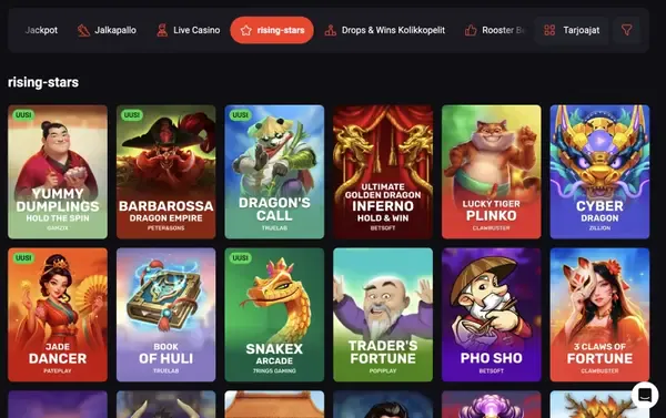 Suomalaisille pelaajille, jotka pitävät vaihtelusta, RoosterBet-kolikkopelit sisältävät monia suosittuja sarjoja Pragmatic Playlta, Play’n GO:lta ja NetEntiltä sekä korkeamman riskin vaihtoehtoja Nolimit Cityltä. Kun vertaat RoosterBet-kasinon kolikkopelit -valikoimaa muihin pelilobbyihin, huomaat, että pidämme monia pelintarjoajia yhden valikon alla, joten voit testata erilaisia mekaniikkoja vaihtamatta sivustoa.